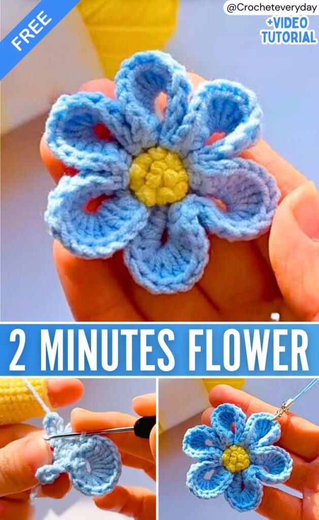 You can crochet this daisy flower in 5-10 minutes. For the yellow centre, you will actually want to make stitches with a sewing needle.