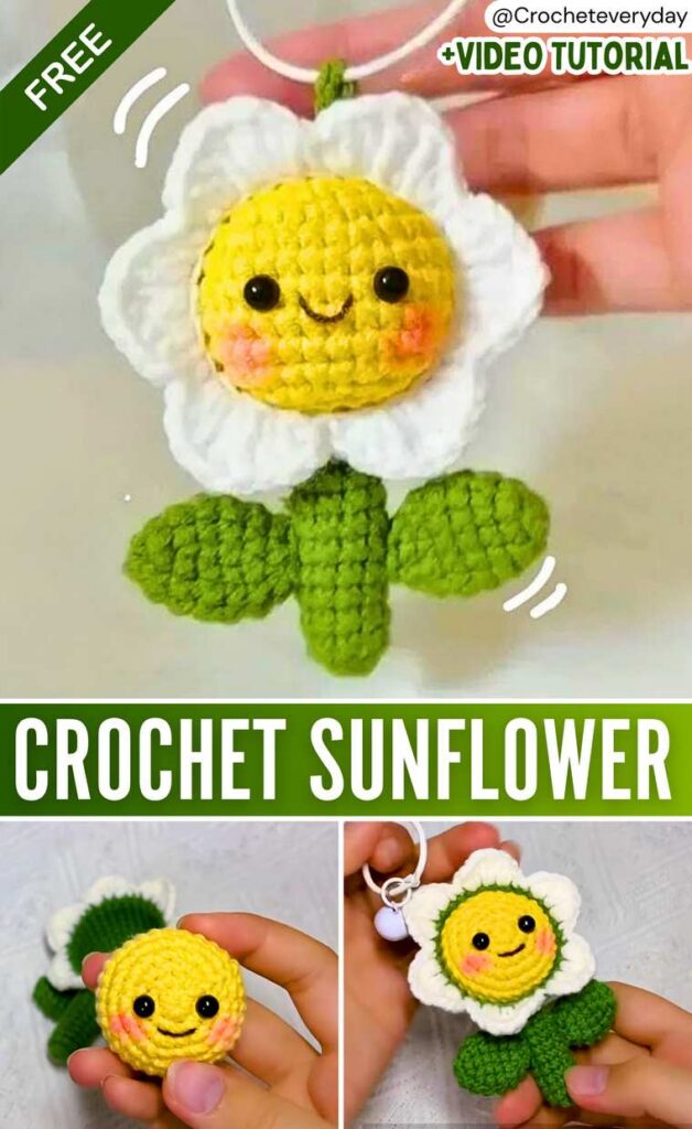 How to make a crochet flower cute? The trick is to add an embroidered smile, blush, eyes, and stuff to the parts. This crochet amigurumi daisy bag charm is the perfect example.