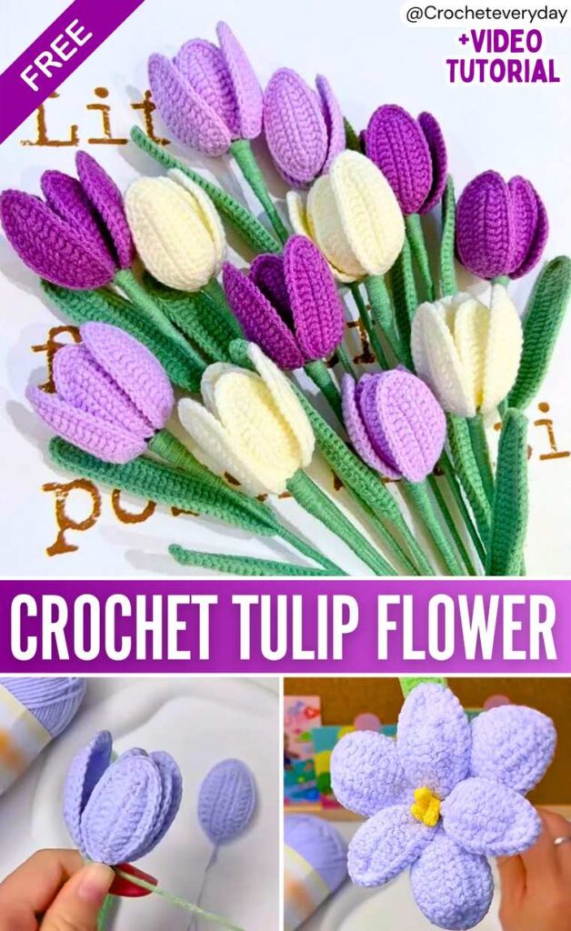 Whether you want to crochet a tulip bouquet or a tulip for a vase, crochet this long tulip flower. It uses the “Individual Petaling” method and also craft wire.