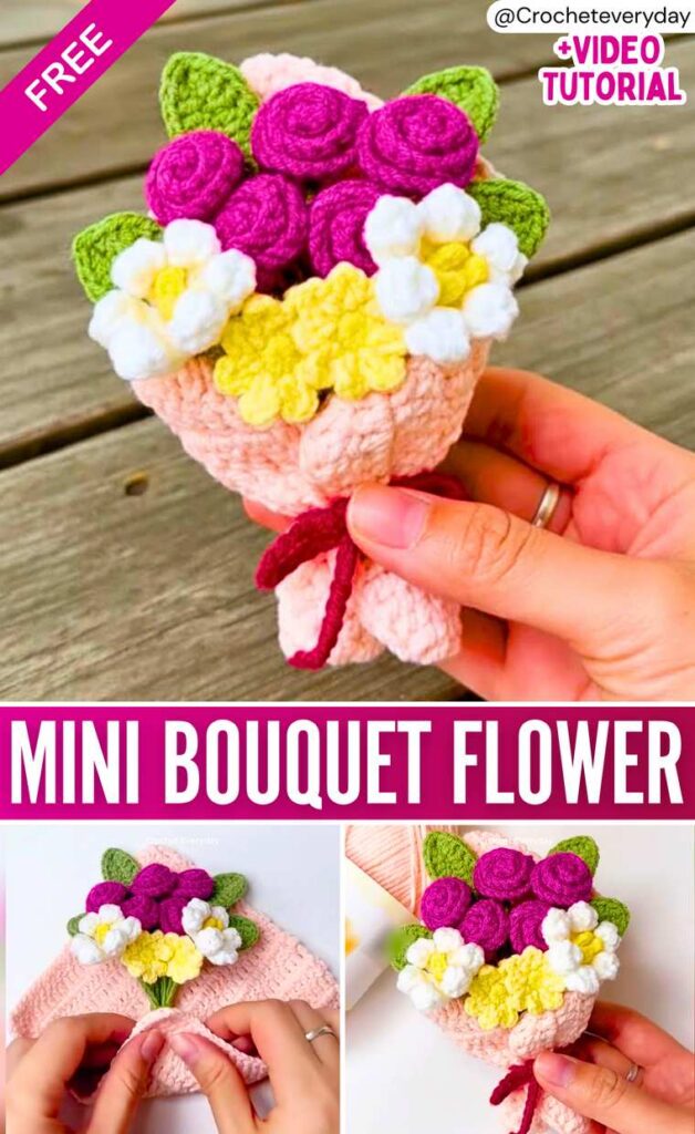 Let’s crochet a three-flower mini wedding bouquet with this pattern. That is a daisy, rose, and basic crochet flowers and leaves.
