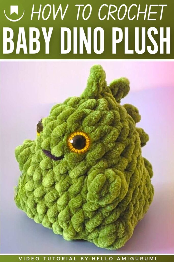 This is an extra chonky, no-sew baby dinosaur plushie crocheted using super bulky yarn and big glitter eyes. After crocheting the body from the bottom up, the back spikes will be crocheted into the body by working a pattern of chain, single crochet, and slip stitch.