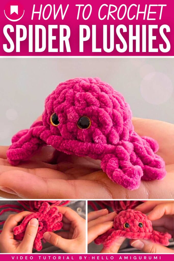 This is UNDENIEABLY the easiest and cutest spider plushie with 8 chain stitch arms, glitter eyes, and a no-mouth face. Just crochet a no-sew round head and crochet the arms as you go. Also worked in a chain-2 loop with 8 single crochet in the first row.