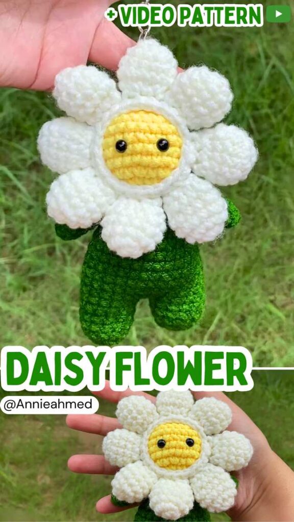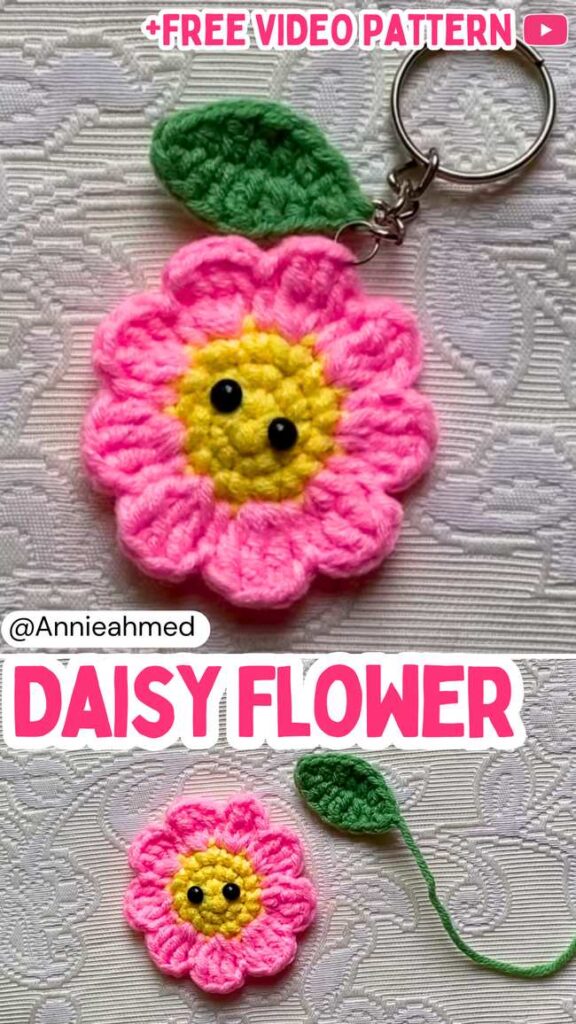This is a simple, easy, and beginner-friendly version of the crochet daisy. With that said, you have to crochet a flat 8-petal flower (again with optional safety beads) and a crochet leaf.