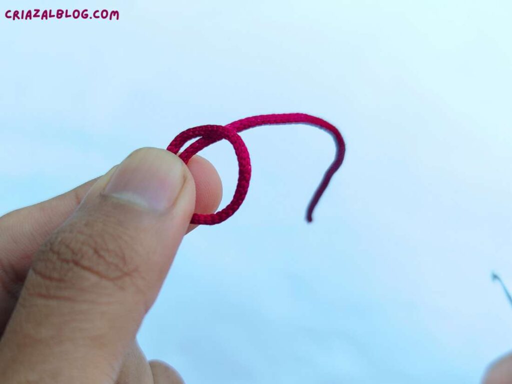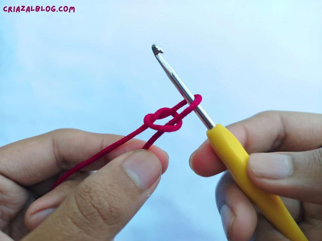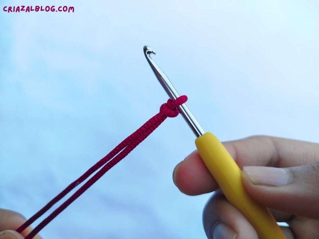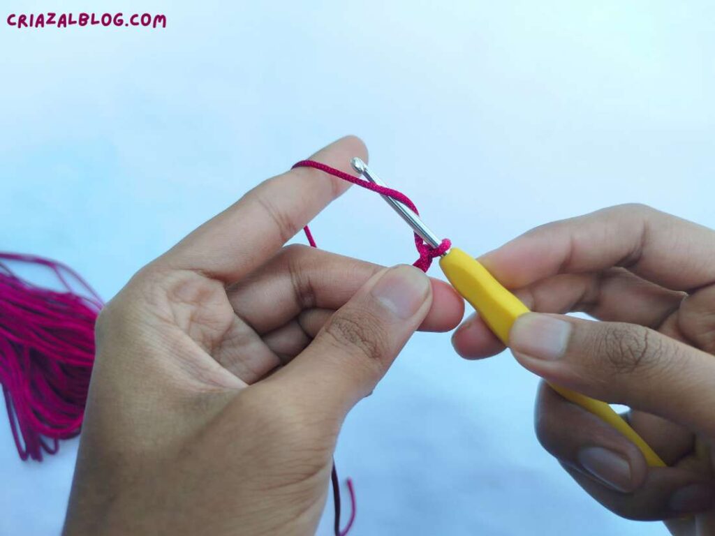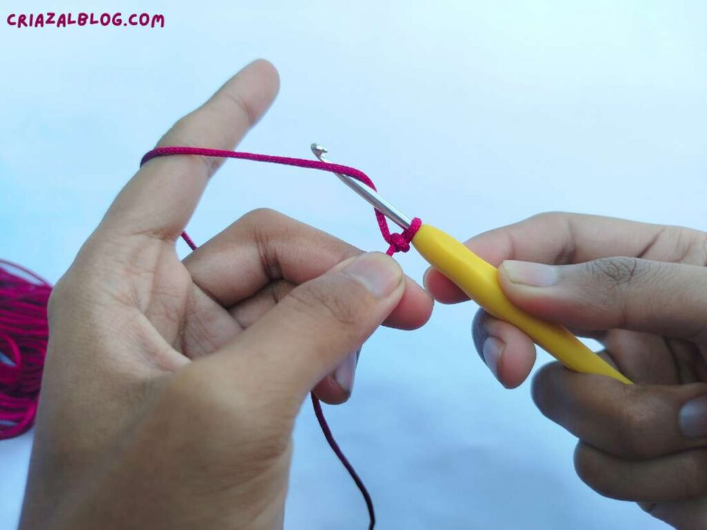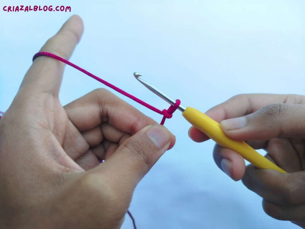 - Attach the hook to the slip knot and hold the crochet hook in your dominant hand, pinch the bottom of the Slip Knot tail in the other hand, and pull it down. For example, in my case, I use my right hand to hold the hook and my left hand to pinch the tail. The strand attached to the yarn ball slides onto your index finger must not be too tight.