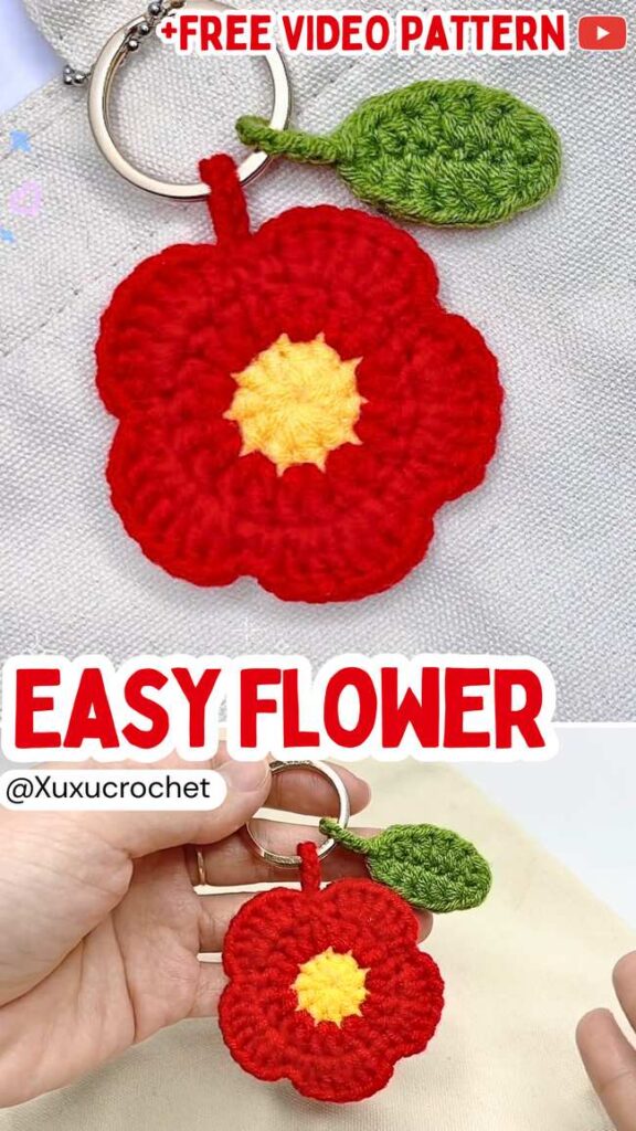 The designer also attached a small chain loop to attach a keyring and basic crochet leaves. While yellow and red yarns work awesome for the Lunar New Year, for perfect Sakura, use two shades of pink.