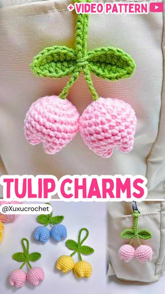 Try the easiest method to crochet a mini tulip bag charm for spring. This design features a pair of stuffed tulips and again leaves, at the top, and a loop of the crochet string.