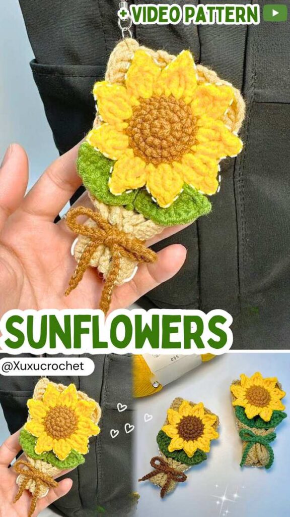 This version of the crochet sunflower bag charm uses the same pattern for the flower and leaves as the first one. The design is pretty creative and elegant.