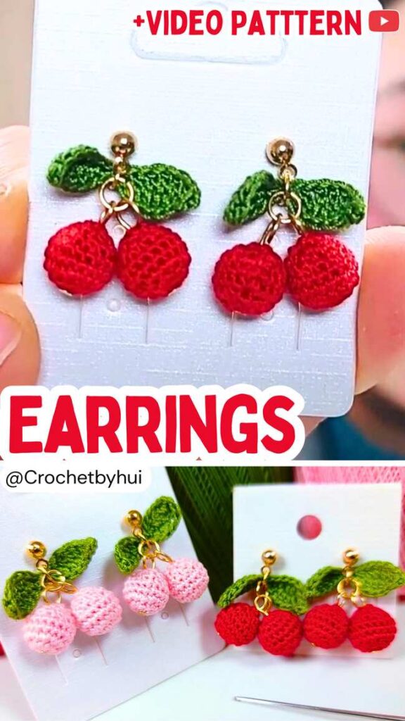 Learn how to crochet mini cherry earrings using a 0.7mm crochet hook and lace yarn. This will feature a pair of mini stuffed cherries and a no-sew pair of leaves.
