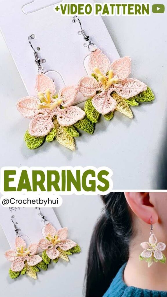 Let’s crochet a pair of life-like peach flower earrings in five parts, including even a crocheted calyx. The other parts are two small leaves, two medium leaves, one big leaf, and a 5-petal peach flower.