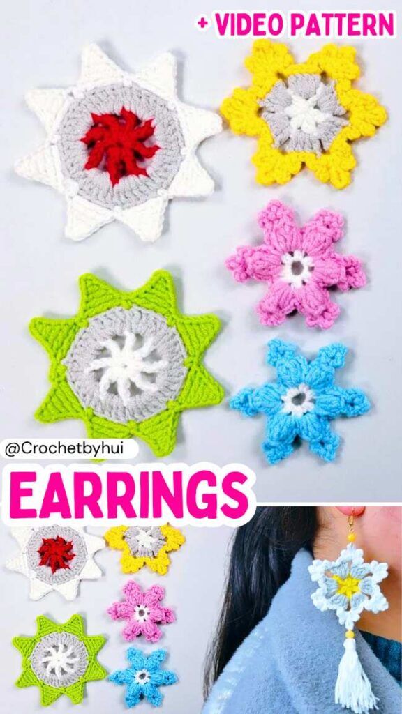 These will still end up as lightweight, no-pain crochet earrings, even with the DK yarn. Because we won’t crochet a lacy snowflake, you can choose from the creative colors, from red to blue, and even yellow.