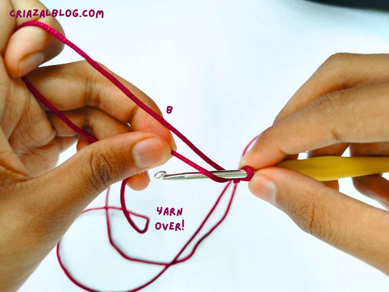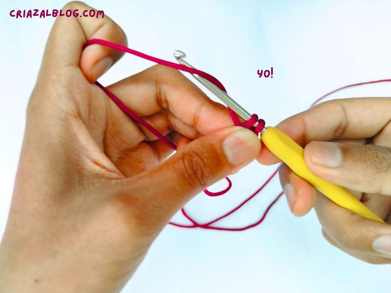 - Step #5: Yarn over the crochet hook using the ball end.