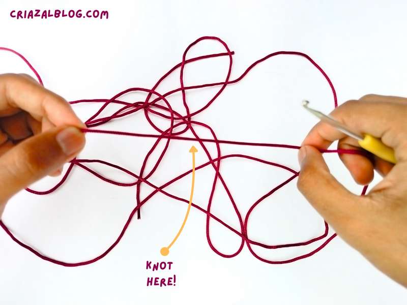 - Step #1: Make the slip knot normally, except to have a longer tail end because we shall use this end to crochet the cord along with the ball end. I would pull and cut a long length from the skein and make a slip knot at about 1-3rd of this length. The reason is that working end takes about twice more yarn. A rule of thumb is that a 12-inch tail will result in a 3-inch cord if you don’t want to cut the yarn.