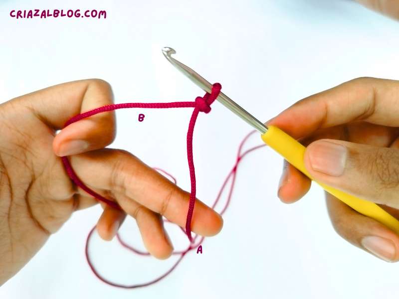 - Step #1: Using the bottom fingers, hold both ends of the yarn under the tail end. This is similar to the yarn over, except that the yarn lives under the crochet hook.