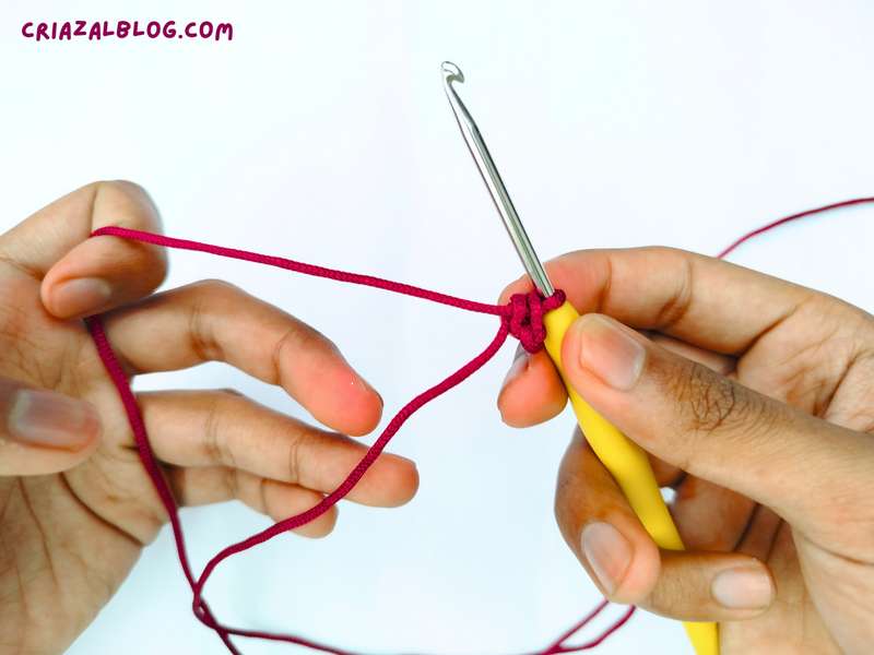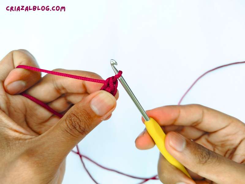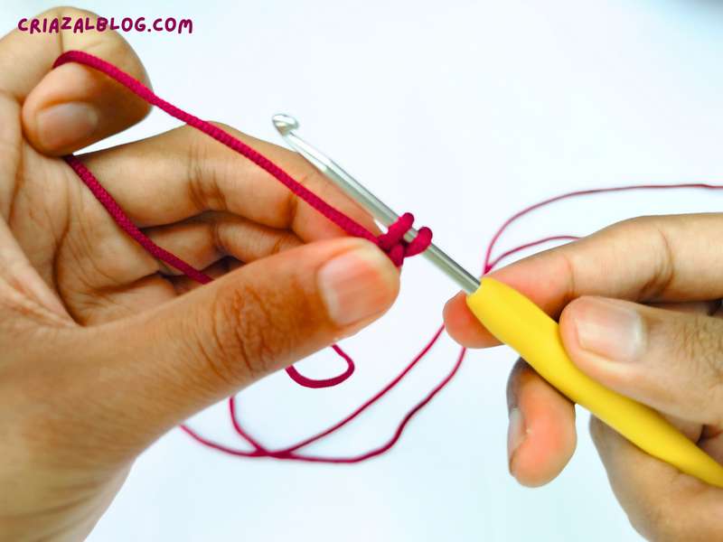 - Step #3: With the thumb and the middle finger of the left hand, wrap the yarn around the hook from left to right.