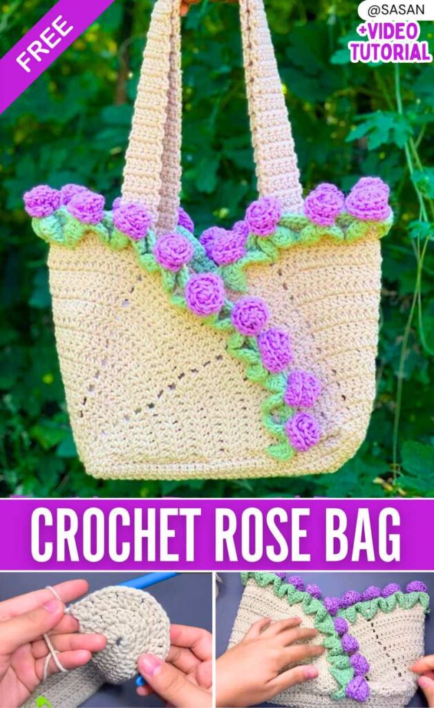 This is a unique variation of the crochet rose bouquet bag and has a wrapped design and ribbed handles. In fact, this bag is assembled from the viral round rose bouquet blanket, upon a crochet oval base.
