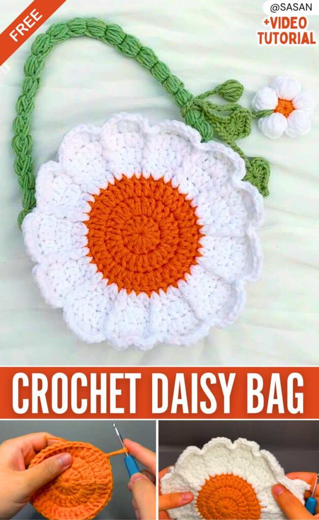 As for crochet flower bags, I wholeheartedly recommend this crochet daisy handbag for spring. With a puff stitch crochet handle, puffy daisy flower, and monstera leaf charm, this is a wholesome and elegant daisy bag.