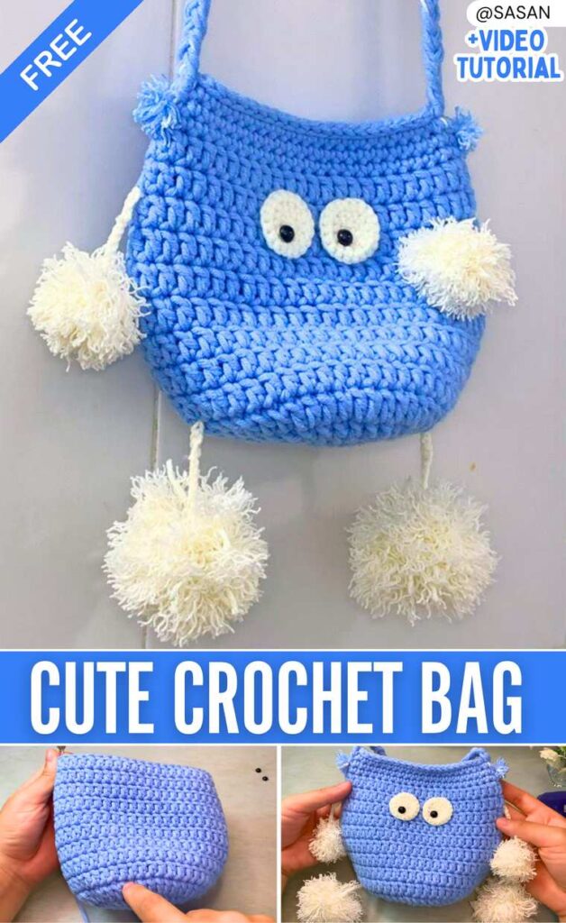 There are chain-stitch legs with pom-pom feet, a basic crochet round for eyes, and chain-stitch straps. All these things are simple and quick to craft and crochet.
