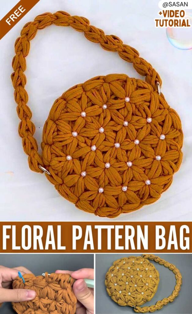 T-shirt yarn bags tend to be stronger, but if you want one that’s also elegant, don’t miss this crochet beaded bag. This is a round handbag featuring a beautiful pattern of puff flowers surrounding the white beads at its centre. There is also a puffy handle attached through the metal rings.