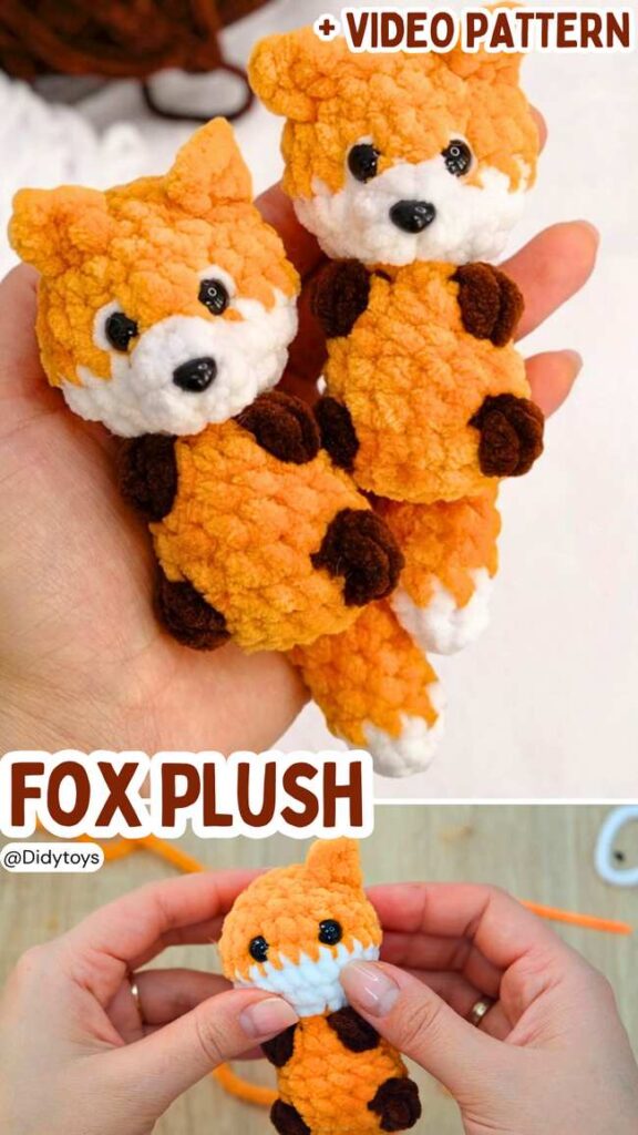 This is also a no-sew fox plushie worked from tail to head, with puff stitch, color changes, and other low-sew techniques. It’s also easier than the viral design and doesn’t require fuzzy yarn.