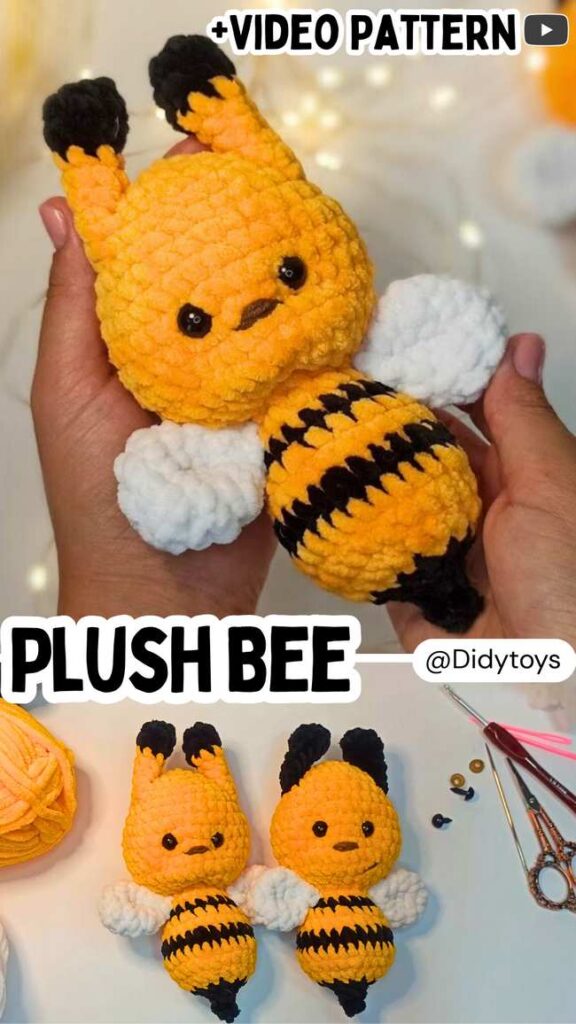 An amigurumi bee is mostly based on two popular designs: a bumblebee and a doll bee. Since many have already seen a plush version of the crochet bumblebee (rainbow bee and black and white bee), I would recommend crocheting this bee plush doll as a present.