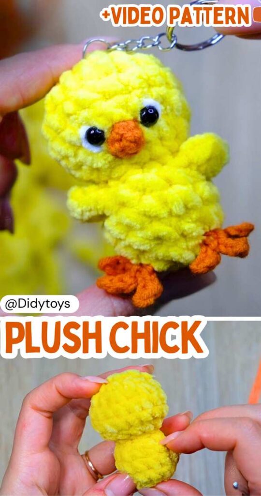 This mini baby chicken plush can be crocheted in less than 20 minutes. The pattern is not completely no-sew, as you have to crochet the beak and the legs separately with thin cotton yarn in orange.