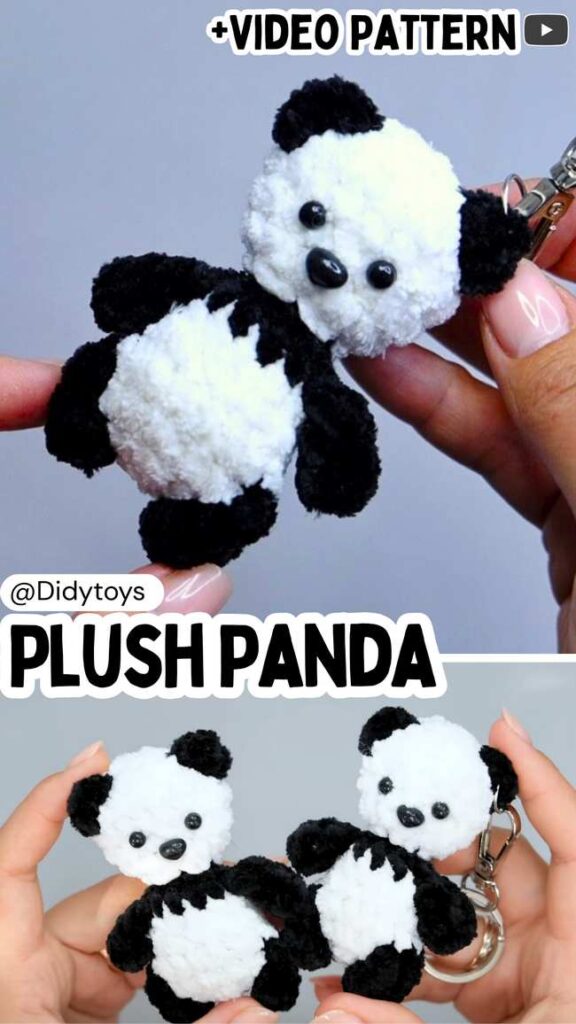 This small panda plush is a miniature sitting doll and can be crocheted in less than 30 minutes. Still low-sew and can be considered as a practice project for seamlessly changing the colors.