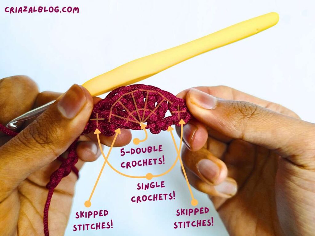 - Repeat across: Skip 2 stitches, 5 dc (shell) in the next stitch, skip 2 stitches, 1 sc in the next stitch.