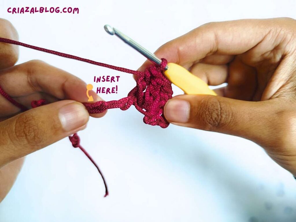 Note: Be sure to work the stitch through both the top and bottom loops of the chain stitch for a neater bottom of the shell stitch.