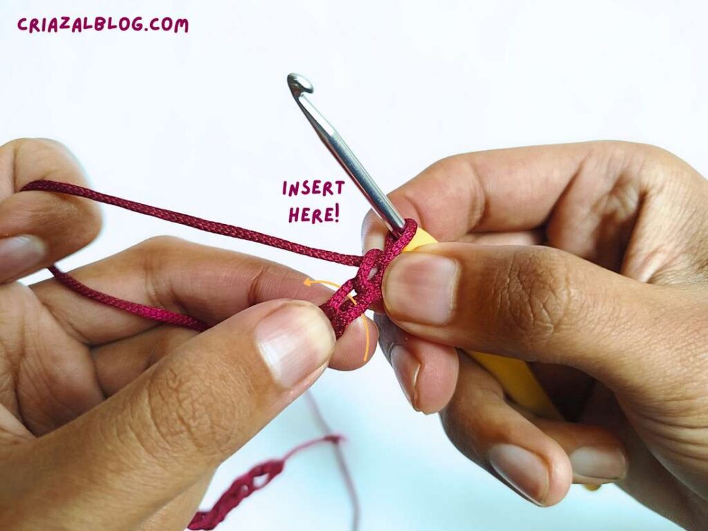 - Skip 2 chains, then work 1 dc in the next stitch.