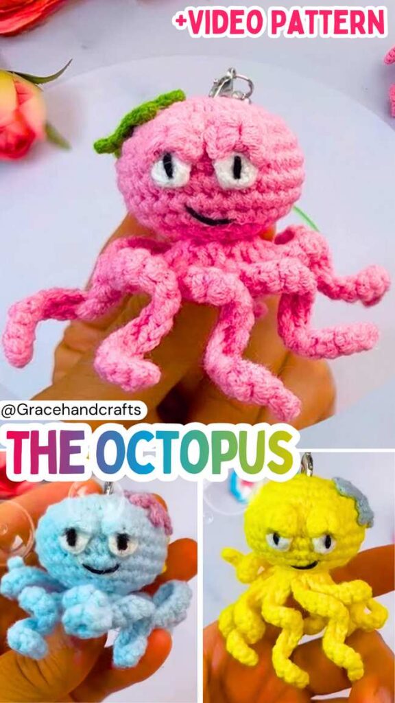 If you crochet it in pink, this octopus amigurumi will be in a strawberry theme, and the topping will be the strawberry leaf.