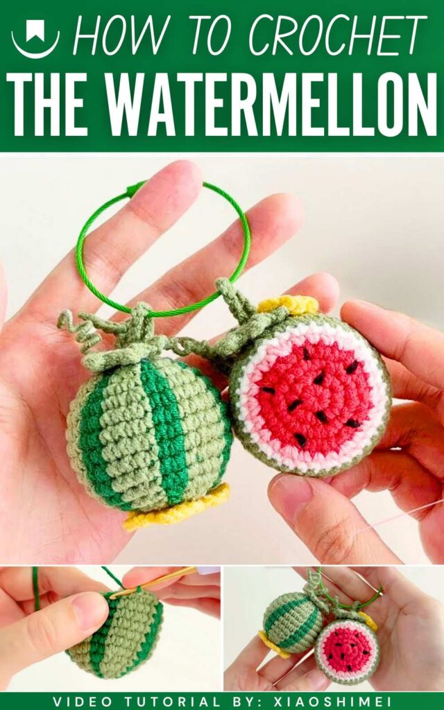 Let’s first crochet this pair of a striped whole and a sliced half watermelon amigurumi. Crochet this bag charm with watermelon leaves, vines, and small yellow flowers, and you will learn the pattern for each in the tutorial.