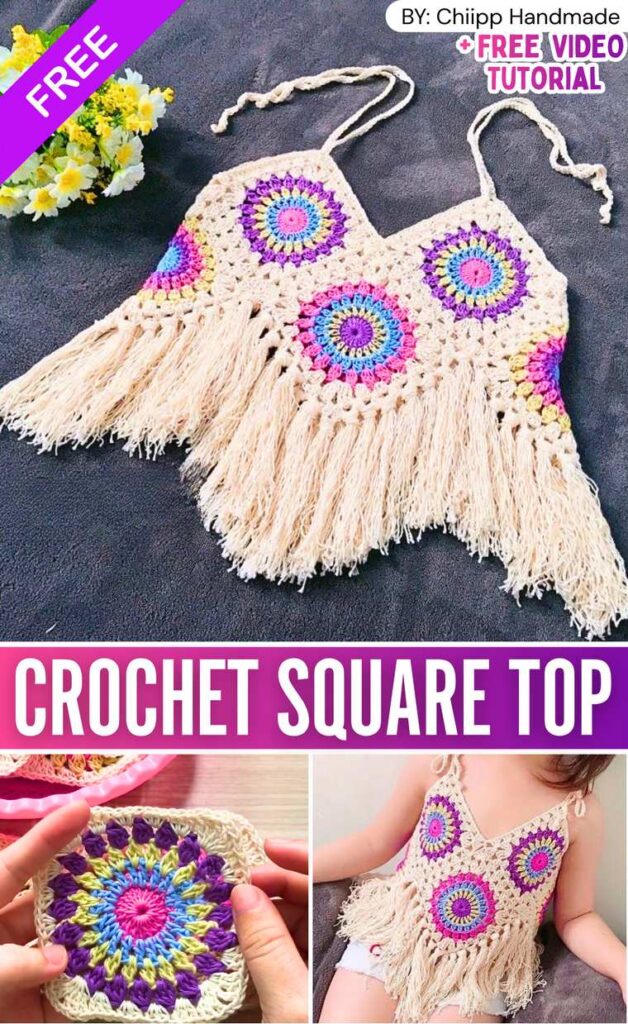 Crochet this colorful boho granny square top for summer and spring with this pattern. The square will be a rainbow burst flower motif requiring single crochet, increase, puff, and classic granny stitch worked in the rounds.