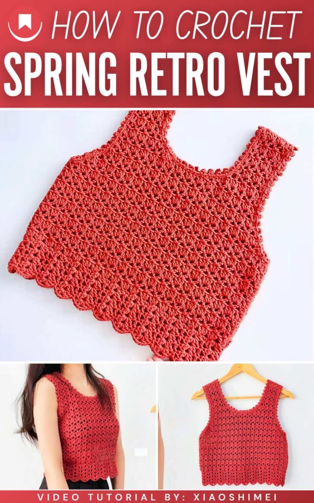 Let’s crochet a beautifully textured vest for summer and spring using cluster V-stitch, picot, and shell stitch. Needs to be crocheted in retro colors like ocean blue, teal, and terracotta using cotton yarn.
