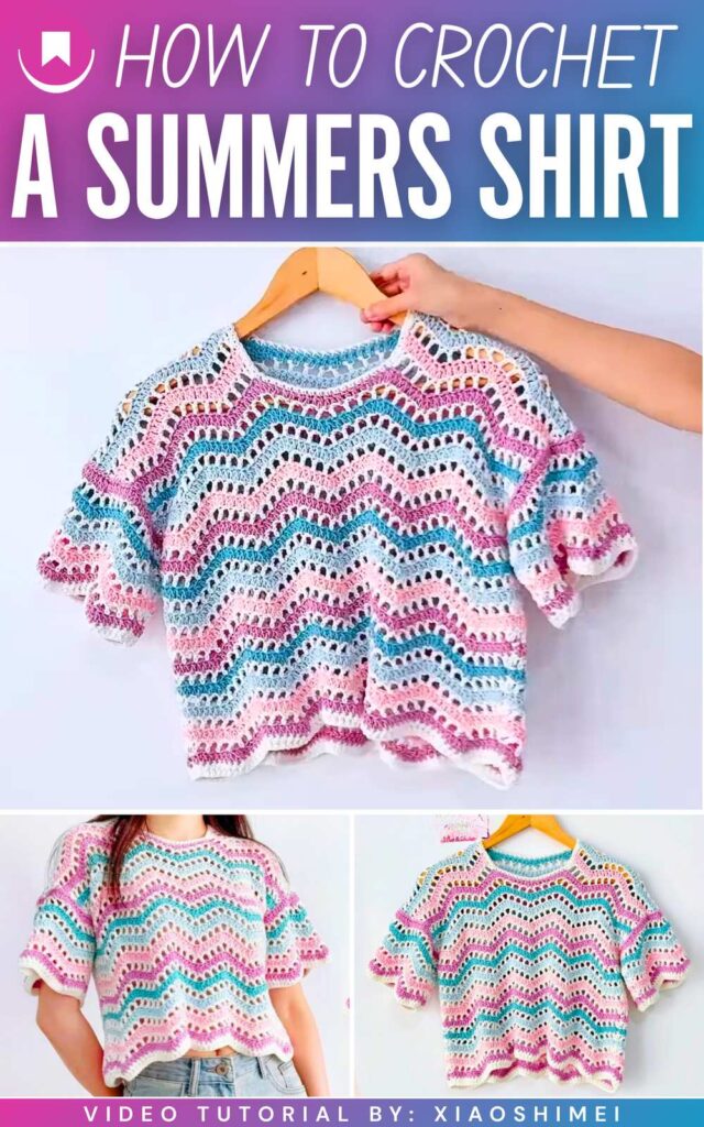 This is a 5-color short-sleeve crop top with alternating wavy stripes and mesh stitch rows. Such a rippled pattern is common in blanket patterns, but with the addition of mesh stitch and thin yarn, makes irresistably beautiful summer T-shirt.