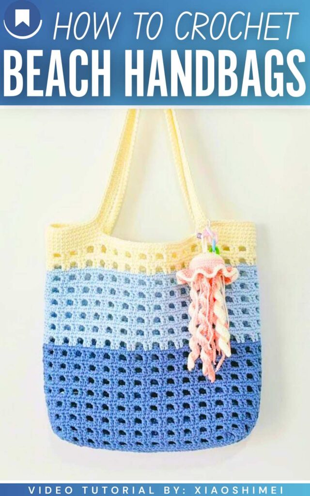 Crochet this beautiful colorwork net beach bag with an elegant jellyfish bag charm following a free pattern. It has three color panels, with the ribbed handle crocheted in the same color as the topmost panel. That looks striking as the topmost pane has fewer mesh rows and the handle perfectly complements it.