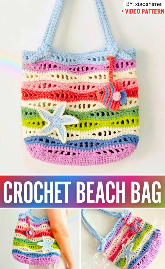 This colorful seaside tote bag has THE MOST appealing striped work due to both the color combination and the beautiful, open wave stitch. You can crochet it with a small fish bag charm and a two-color starfish, and the patterns for both are available.