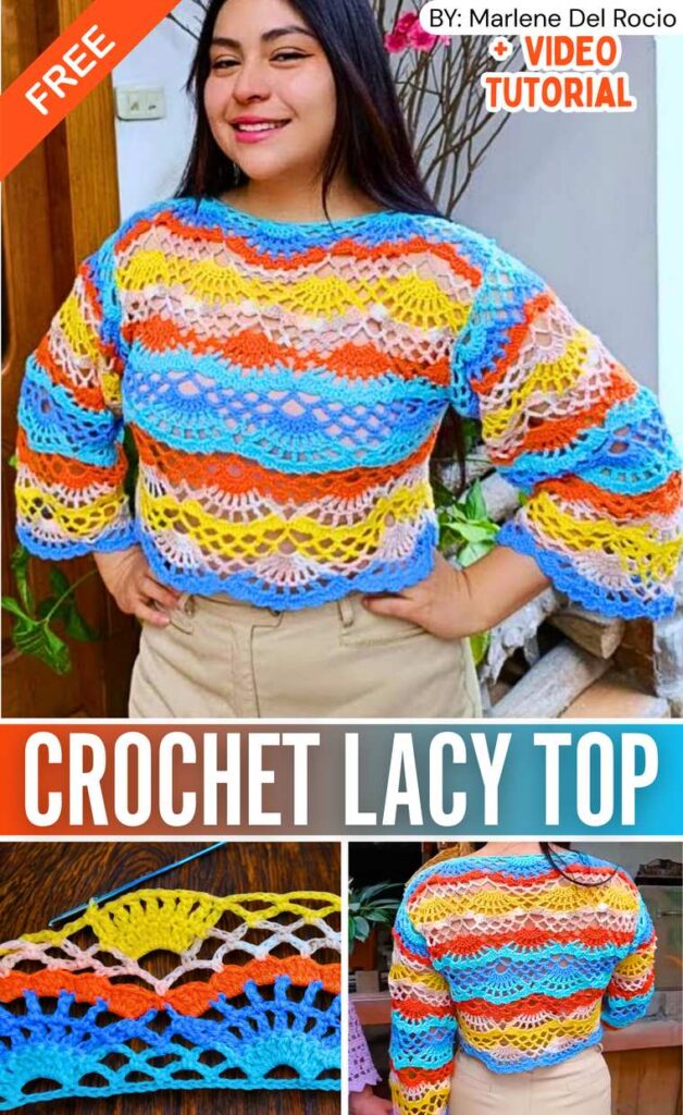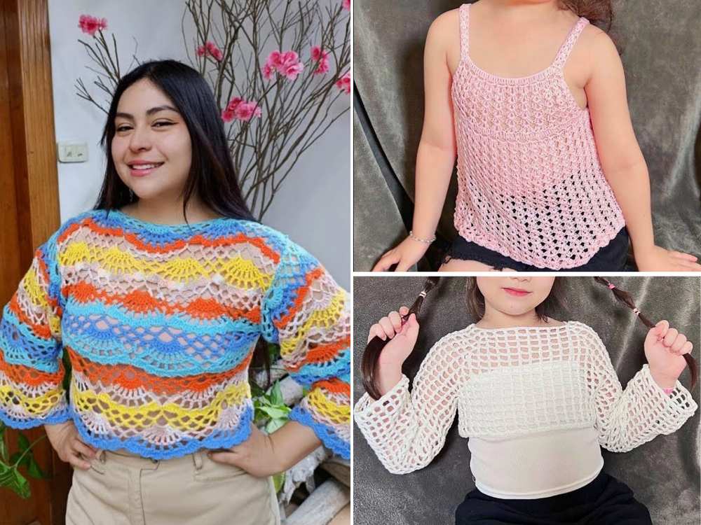 Crochet these unique lacy Summer top designs to stand out this summer, including full-sleeve, tank, cropped, and flared tops. There are pretty interesting stitch patterns to choose from. That is the easiest, like mesh and cluster lace, to the advanced ones, such as lacy shell stitch and joined flower stitch.