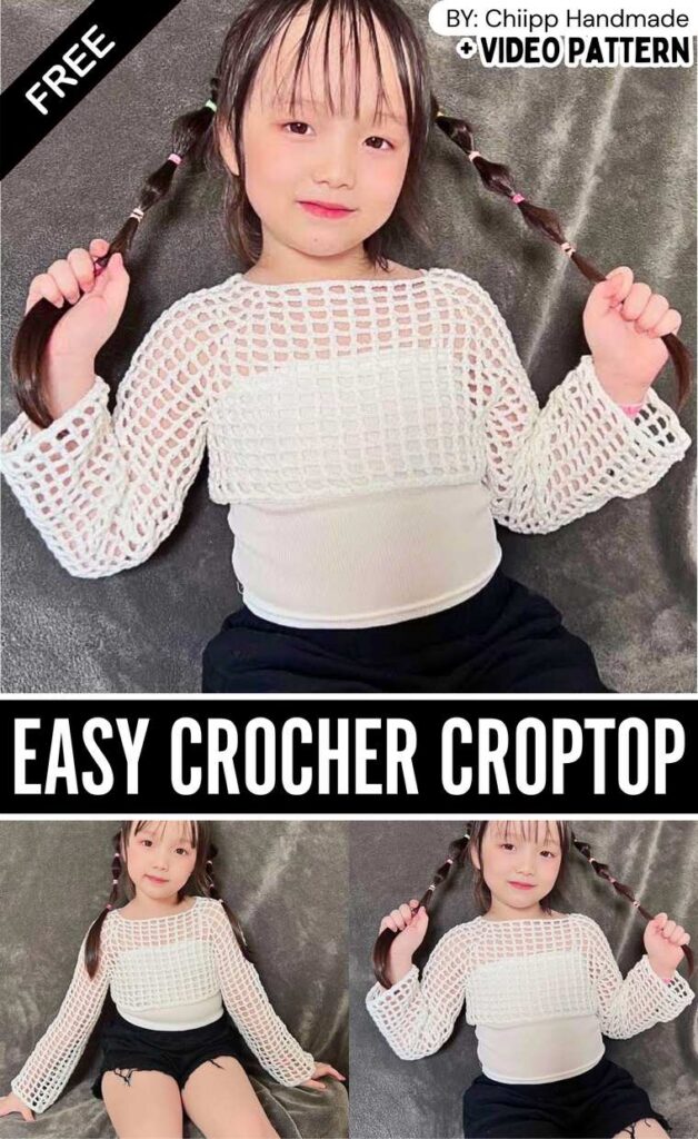 Let’s craft an easy full-sleeve crop top that can be worn over a camisole for beach visits. Requires the most basic mesh pattern, also called “Crochet Square Filet.” For this top in particular, the number of starting chains must be a multiple of four.