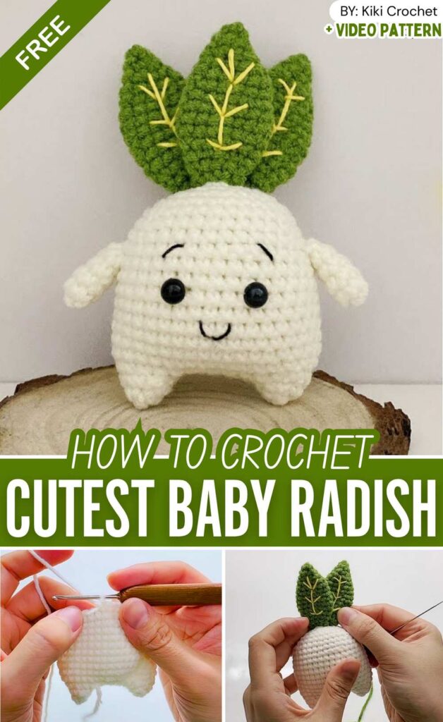 Let’s crochet a kawaii baby radish amigurumi with this low-sew and easy pattern. This is designed as a Vegetable Buddy Amigurumi. So, you will want to crochet a white Chibi doll with radish leaves as hair.