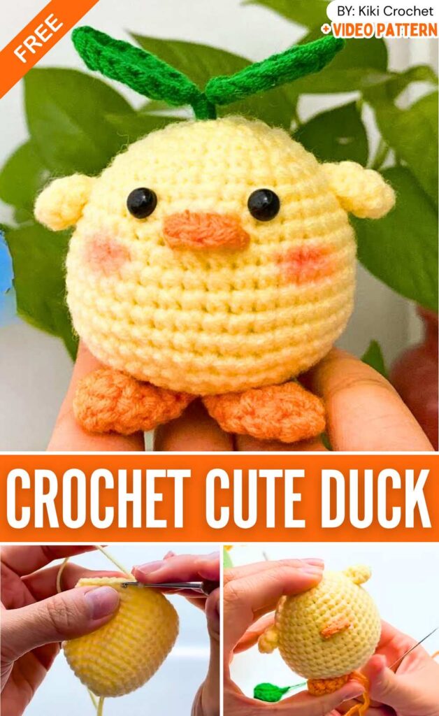 Let’s crochet a cute and funny baby duck amigurumi that is growing a little vegetable sprout on its head. The sprout is just a pair of vegetable leaves attached to a yarn-wrapped craft wire. This way, you can also easily insert and secure it as a hat on the chick’s head and pose it.