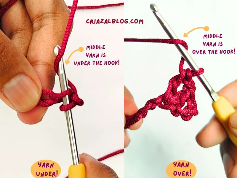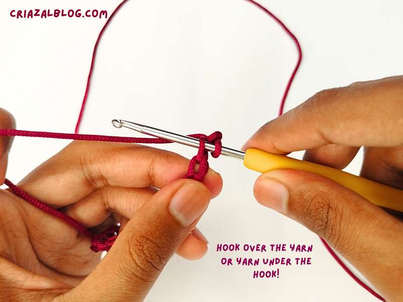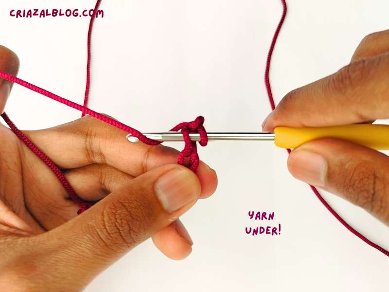 • Yarn under. Bring the hook over the ball end of the yarn and now twist the hook around, going right to left (if you are right-handed) from the bottom and grab it using the grip of the hook.