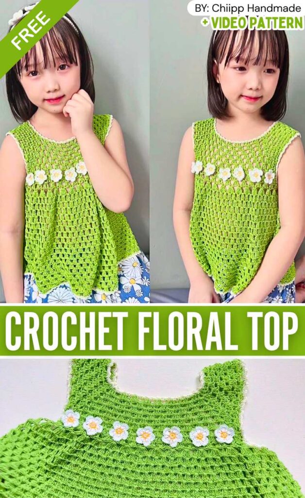 With elegance and comfort of granny stripe stitch and daisy flower appliques, this crochet vest-style flared shirt is a must-have summer wear. There is also a single crochet picot edging in white around the whole top.