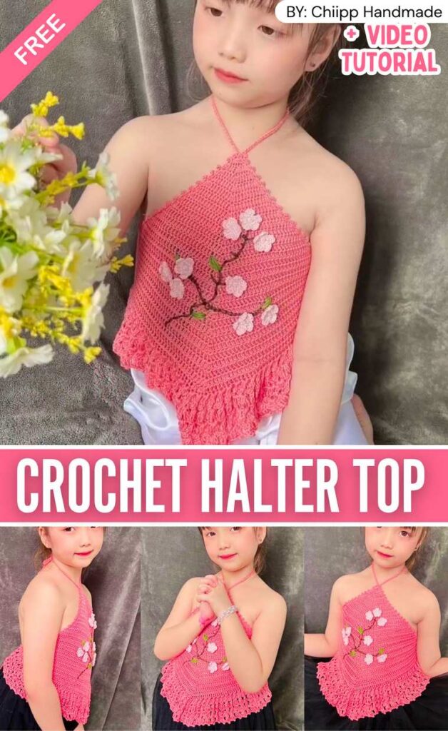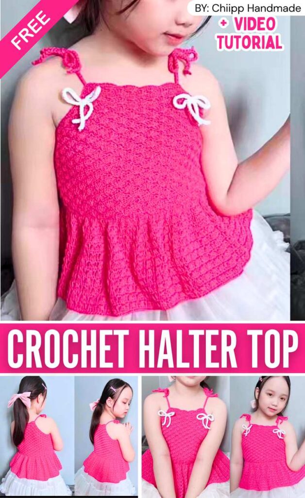 This simple pattern adds ruffles and a pretty texture to the skirt. Following the pattern and recommended materials, you can crochet this halter top for an 8-9-year-old girl. However, just by adjusting the foundation chains, you can easily crochet up XL.