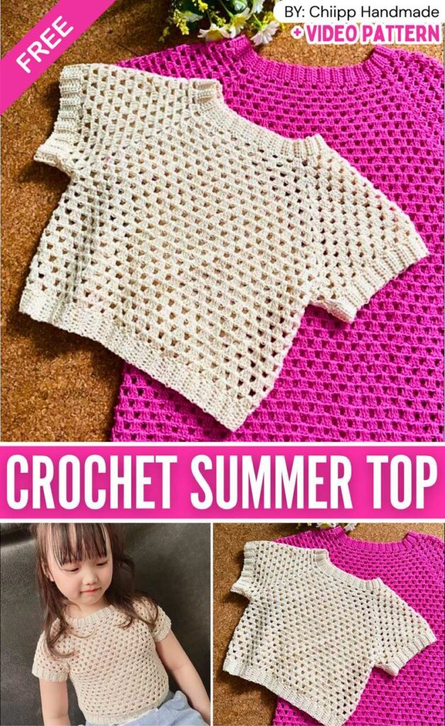 This is a beautiful cropped mesh T-shirt with ribbing around the neck, bottom hem, and sleeves. Requires granny stripe stitch and is worked from top down to the bottom.