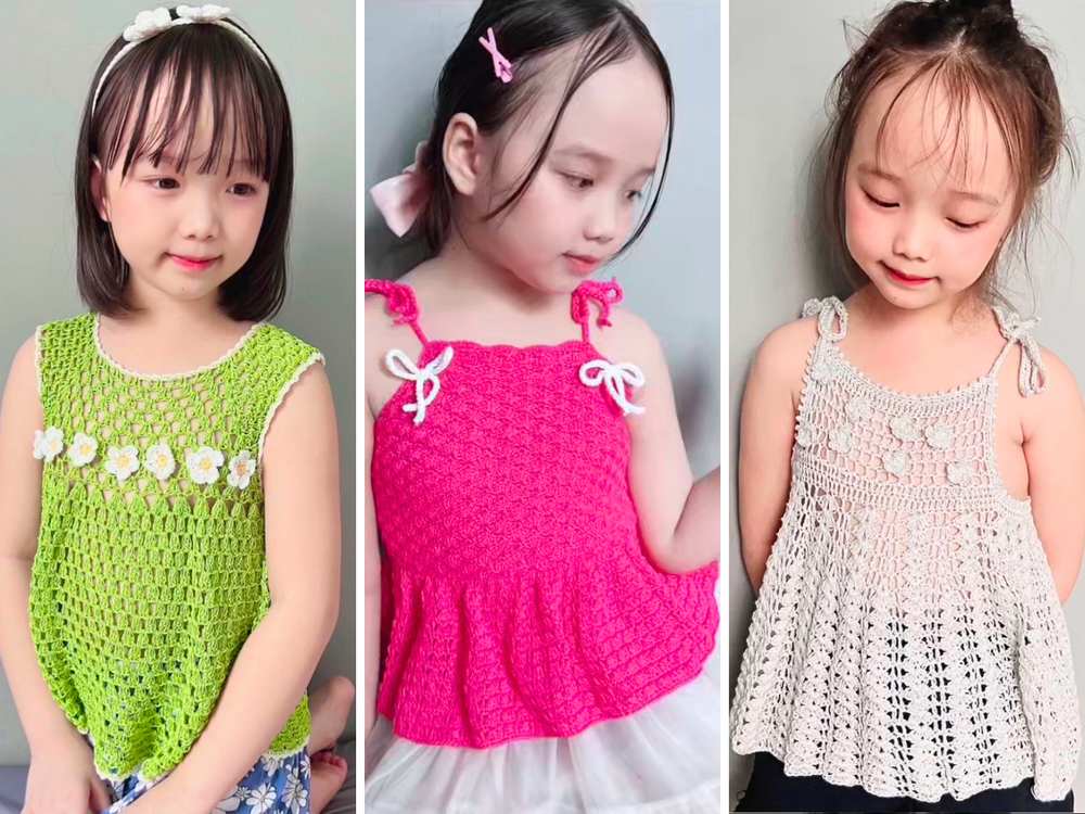 With the 0.8mm cotton yarn and 1.75 mm crochet hook, you will have a pretty lightweight and airy top. You can crochet it in a size for a 9-month-old to adults, and also make it oversized.