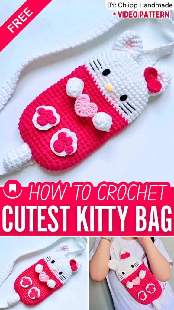 Unlike the bag in part 1, thanks to the shape of the bag and colorwork, you can crochet the full body of Hello Kitty. There are stuffed ears, arms, and tail, and flat add-ons like a bow, cat paws, 1-round crochet heart.