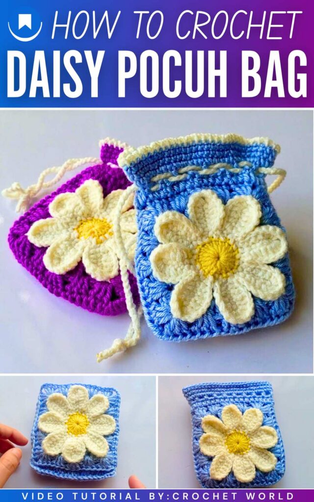 Crochet this beautiful spring drawstring pouch from two big daisy granny squares. The squares are joined on three sides using a darning needle, and then worked upward, from the open side.