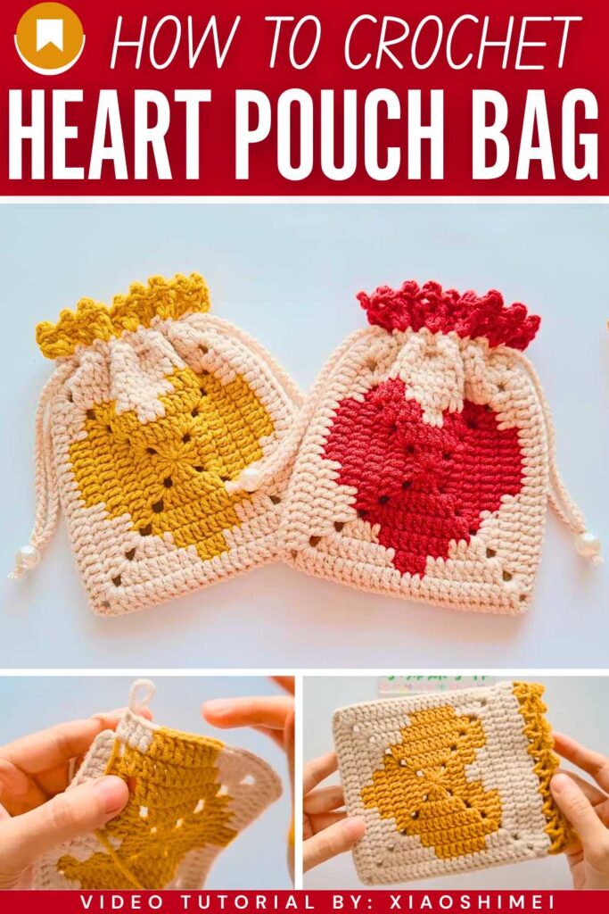 If you find the tapestry difficult, you can also crochet my 2-round heart and work a solid granny square around it. Then follow the method to turn it into a pouch. The edging requires picot, chain, and single crochet.