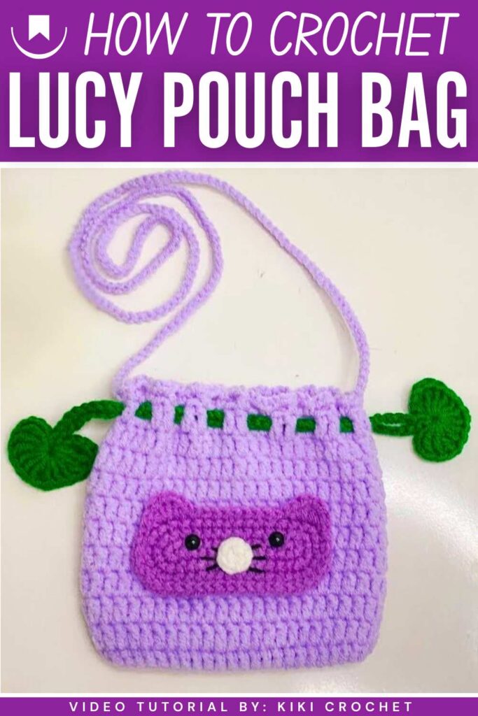For kids, crochet this easy drawstring bag with a cute cat applique named “Lucy Pouch.” There are also maple leaf charms at the end of the drawstring and an optional crossbody strap.