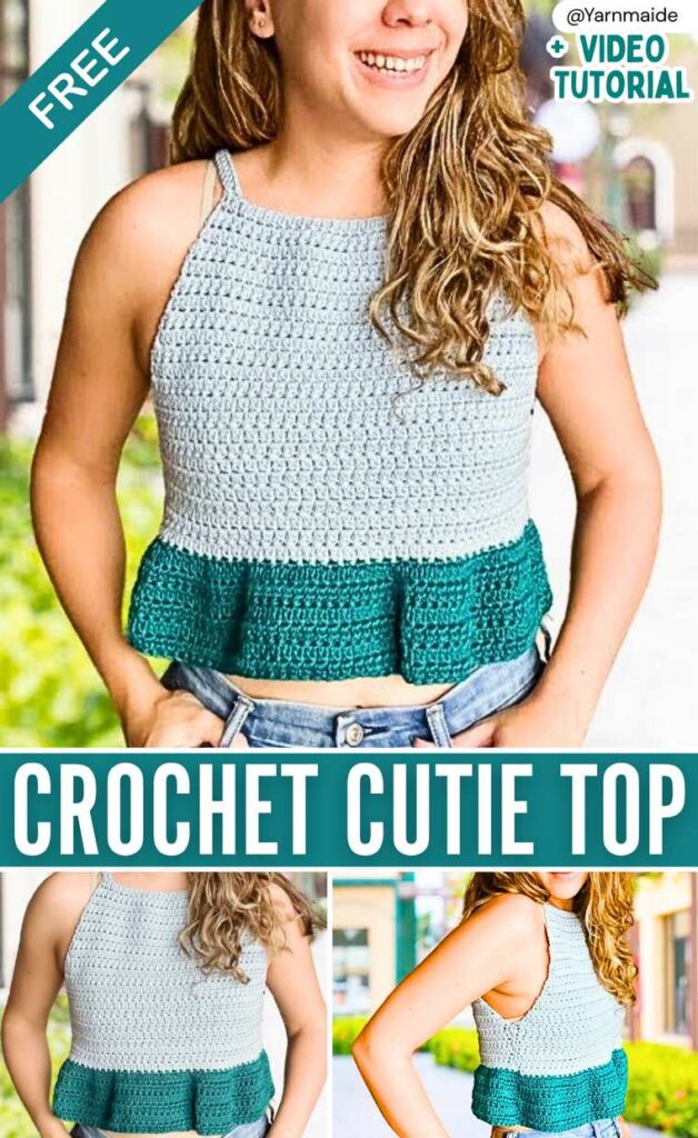 This is a sleeveless, cropped summer top featuring a ruffled color panel at the bottom and shoulder straps. With an easy but elegant texture of double crochet two together, this is definitely a “Cutie Top.”